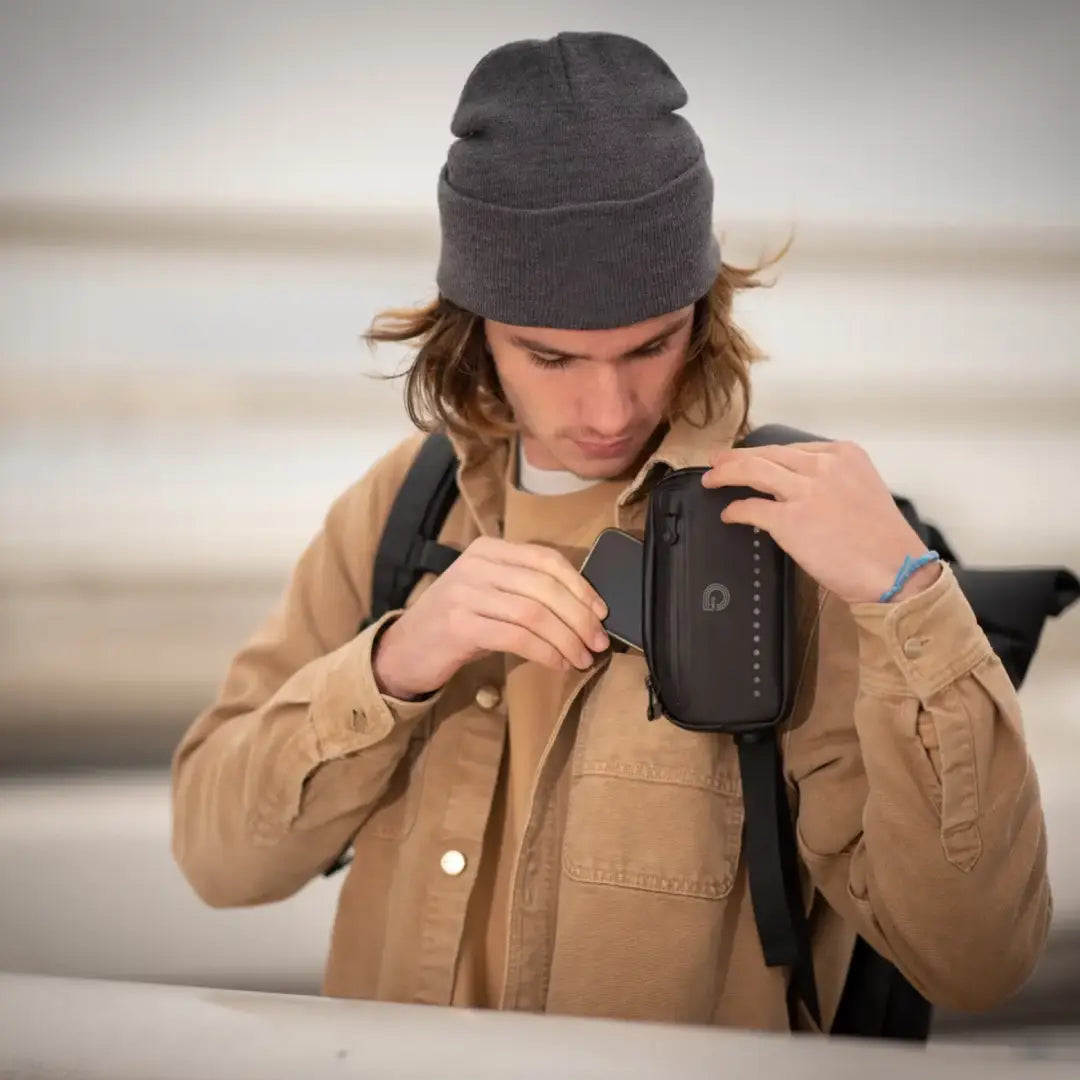 The Pass pouch comes with different straps to be able to carry it in all possible ways. The large strap allows you to put it around the chest or waist like a fanny pack, while the small straps allow you to attach it to a bike.